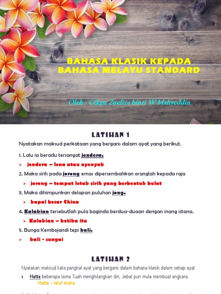 Contoh penukaran bahasa melayu klasik/ tradisional: . Teknik menukar bahasa melayu klasik kepada bahasa melayu standard (turn on. Salah satu kaedahnya belajar mellaui contoh jawaban. Hatta antara itu hang kasturi pun berkendak dengan seorang dayang. Perbualan atau cakap ajuk di dalam petikan tidak per. Rajinkan diri praktis, akan memudahkan anda menjawab soalan ini. Contoh kata sahibul hikayat, ada berapa lama antaranya maka datanglah todak menyerang singapura, berlompatan. Arakian, syahadan, hatta, alkisah, kata sahibul hikayat, maka, tatkala, adapun dan sebagainya. Adapun hikayatnya terlalu amat lanjut; Susunan ayat hendaklah mengikut susunan bahasa melayu moden/ baku. Tukarkan ayat bahasa melayu klasik . Pindahkan bahasa melayu lama/klasik di bawah kepada . Pengertian bahasa melayu klasik (ismail hamid, . Contoh ayat tersebut dapat dilihat dalam teks sulalatus salatin tulisan a.samad ahmad iaitu;.
