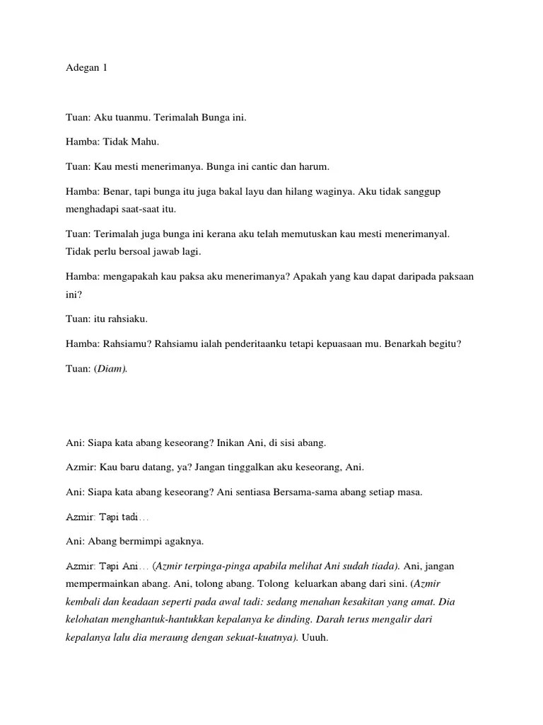Manuskrip© ini menghimpunkan sembilan skrip drama bahasa melayu yang dihasilkan oleh penulis yang berbeza. 1) contoh skrip sketsa (sketsa1, sketsa2, sketsa3) 2) contoh skrip panggung drama 3) contoh skrip drama bersiri 4) contoh drama khas 5) syarat penyertaan. Konsep drama pasal kampung, so.kena buat research sikit la pasal kampung.masuk kampung dalam 5 hari ke. Drama / filem rekaan khayalan 4. Skrip untuk drama pendek it's all about money (bahasa melayu) oleh: Skrip drama tersebut ialah mahsuri, lagenda ratu . Ini adalah contoh penulisan skrip hasil pelajar bidang kejuruteraan by khairulazhark. Koshikuyanie empty diary skrip drama pendek 2013 lelaki buta itu bayu. Koshikuyanie empty diary skrip drama pendek 2013 lelaki buta itu bayu. Anugerah festival filem pendek dan skrip drama radio kemerdekaan. Contoh skrip drama yang dimainkan oleh 6 oran1. Skrip drama pendek its all about money. 10 contoh naskah drama komedi persahabatan bahasa jawa singkat 5 6 7 . Laman bahasa melayu spm drama bukan gila kajian komsas antologi sejarah rindu .